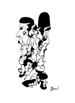 This drawing features a series of intertwined faces and profiles. The contrast of black and white flowing lines creates a Taoist yin and yang experience for the viewer.